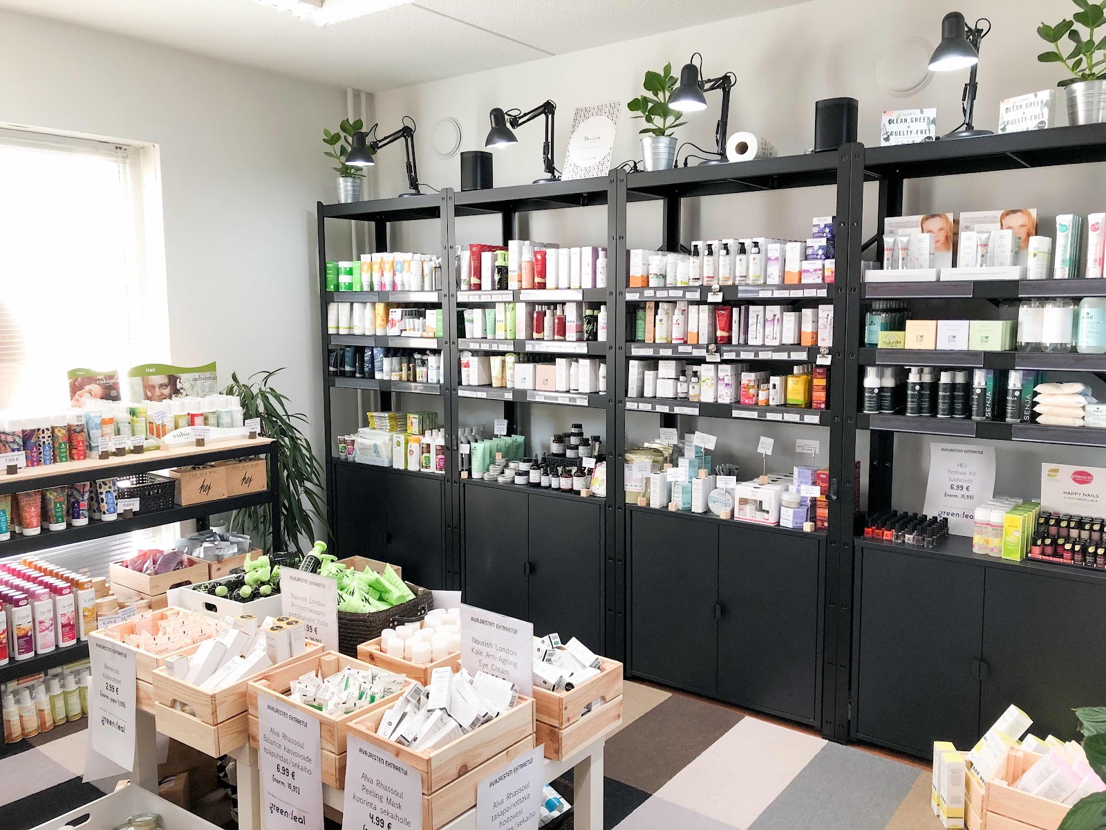 Greendeal säljer väldigt lite smink i butiken, men tex Benecos och Avril nagellack och mascara fanns (på nätet finns det mycket mer). Krämer, shampon, dushgel och dödön fanns det mycket av (tex. Lavera, Nourish, Hej). Ett bra urval och nya märken för mig fanns det av diskmedel, tvättmedel och städprodukter. Mest nyfiken är jag på doftdropparna jag köpte (äppel och lavendel), som man sätter ca två droppar av i sköljmedel luckan och byket får en god doft utan kemikalier.