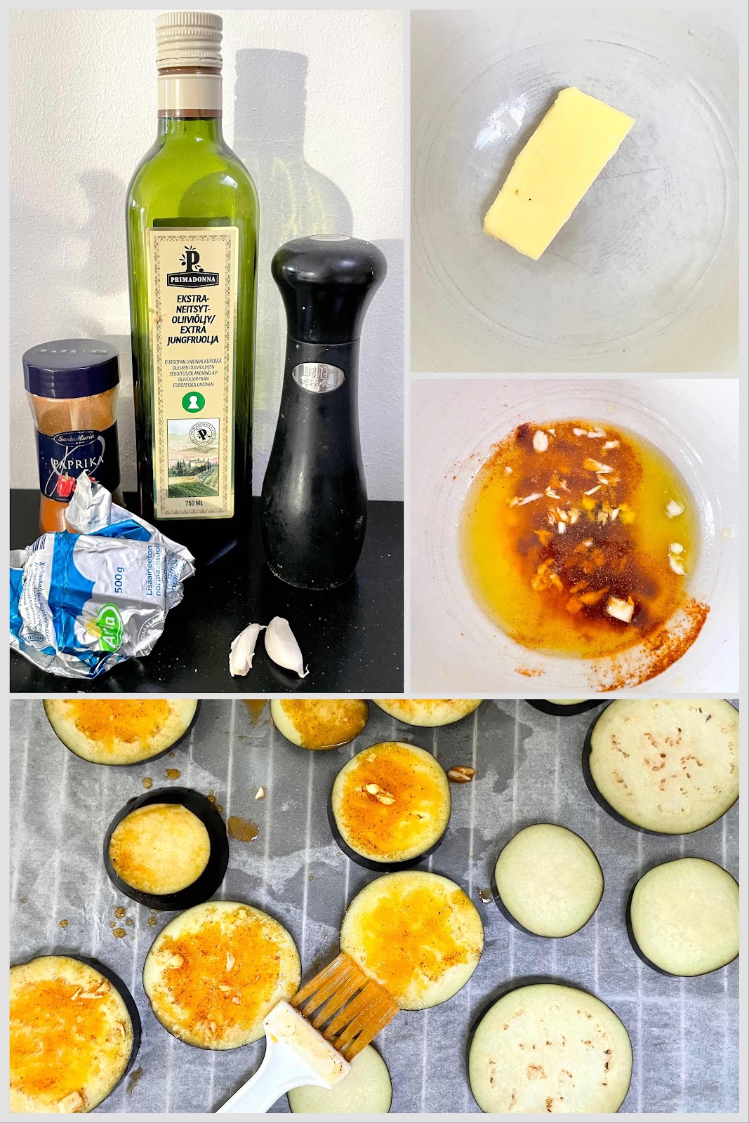 Skär auberginen i ca 1cm skivor. Sätt smöret i mikron och blanda sen i resten av marinaden. Pensla auberginen på båda sidorna och sätt i ugnen 220c 40 min.
